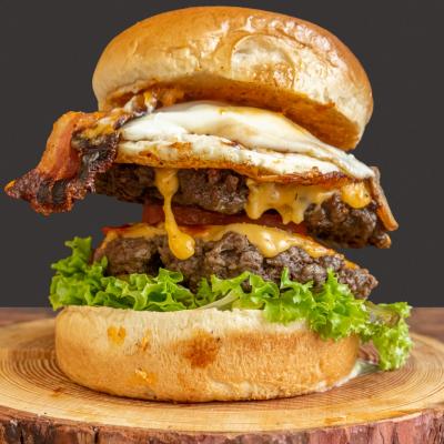 Z podwójną wołowiną, pieczarkami, jajkiem, serem, beconem, czerwoną cebulką, pomidorem, sałatą, piklami, sosem autorskim oraz bułką maślną