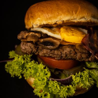Z wołowiną, pieczarkami, jajkiem, serem, bekonem, cebulka, pomidorem, papryczkami jalapeno, sałatą, piklami,sosami piri- piri i autorskim oraz bułką maślną