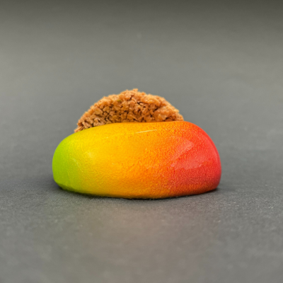 Mus z białej czekolady z owocami cytrusowymi, galaretką i sokiem mango podany na spodzie z białej czekolady