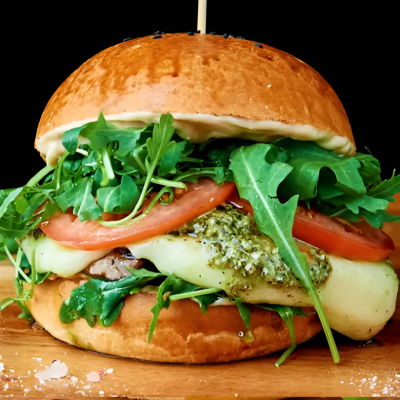 Grzyb Portobello, 2x mozzarella, sos pesto, sos majo-sriracha, 2x pomidor, rukola.