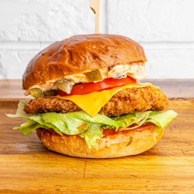 Panierowany filet z kurczaka, 2x cheddar, sos bufalo, pomidor, sałatka, sos firmowy z ogórkiem kiszonym.