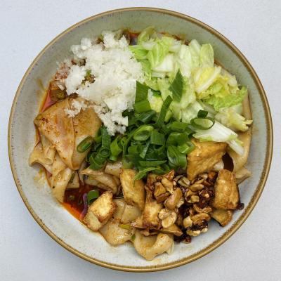Ręcznie rozciągany makaron w formie długich wstążek podawany w klasycznym stylu chińskiej prowincji Shaanxi. Aromatyczne przyprawy – czosnek, pieprz syczuański, płatki chili i por zasmażamy gorącym olejem, by utworzyć wyjątkowy, pikantny sos, który charakterystycznie łaskocze podniebienie. Podajemy z blanszowaną kapustą, tartą rzodkwią i dymką, oraz tofu i orzechami nerkowca.