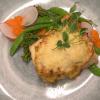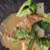 Z polskiej hodowli Grabinek z porem i parmezanem na puree z batat, z młodymi warzywami