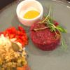 Pieczony w pergaminie, na pomidorze z oliwkami i kaparami, kolendrowym kuskusem i...